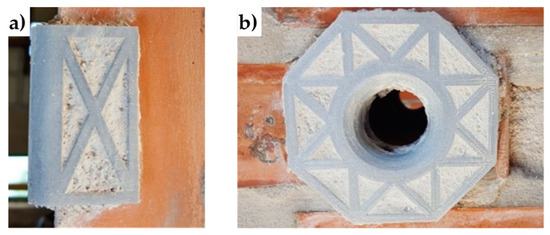 Each drilled hole serves for the passage of up to six straps with different directions. Therefore, the transverse holes divide the wall into units of masonry that receive a post-compression by the pre-tensioned straps. In the case of rectangular arrangement of the holes, as in Figure 4a, the units of masonry have the shape of parallelepipeds.
