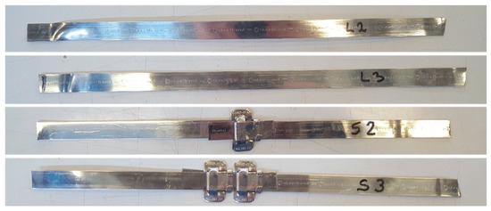 The reason that led the authors to change the materials of the tying system lies in the analysis of the results of Section 4. In particular, on the one hand, those first results showed that the CAM-like straps are actually able to provide an I-beam behavior that is particularly noticeable after delamination. However, on the other hand, the delamination load does not increase in a sensitive way. Assuming that the normal stresses at the interface between strips and straps increase the delamination load—due to the friction forces (Figure 20b)—it is, therefore, possible to conclude that stiffer strips would increase the delamination load. This suggested the authors to replace the steel ribbons with steel wire ropes.