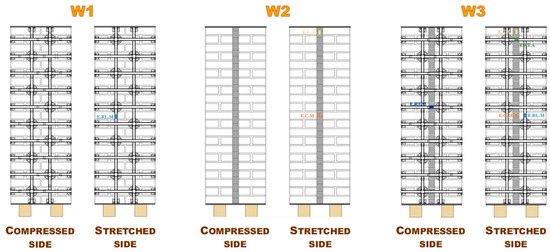 In the explanatory scheme shown in Figure 17, the masonry wall enclosed between the two CFRP strips acts as a lost formwork, as it serves to define the distance between the two flanges of the ideal I-beam and remains within the construction. The thicker the masonry wall, the higher the web and, consequently, the greater the moment of inertia of the ideal I-beam [17].