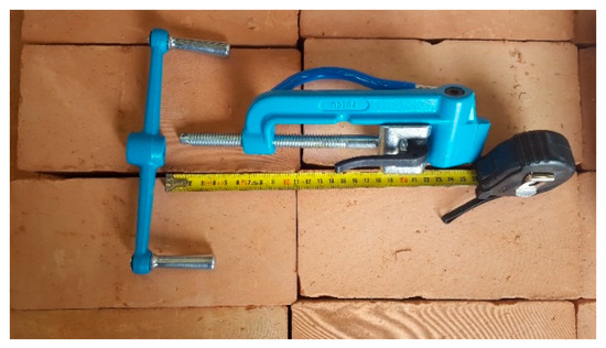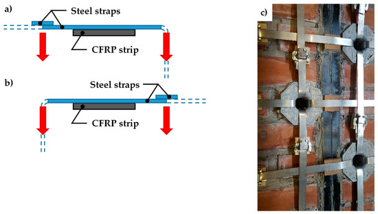 The CAM system consists of a three-dimensional net of stainless steel ribbons, which form closed loops passing through some holes, obtained by drilling the thickness of the masonry wall (Figure 4a). The use of stainless steel avoids the occurrence of corrosion problems [6]. When clamping the ribbons, a special tool provides a pre-tension to the ribbons, which then post-compress the masonry that they wrap (Figure 4b). Therefore, the CAM system is an active reinforcement technique that uses tensioned steel ribbons, which strengthen the masonry in the same way as the metallic straps strengthen the packages in heavy applications. Because of this analogy, the authors will refer to the tensioned ribbons of the CAM system as “the straps.”