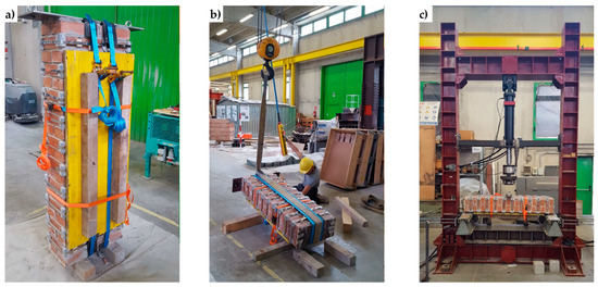 The photos shown in Figure 53, Figure 54, Figure 55 and Figure 56 are part of a second experimental program on the combined techniques, performed at the LiSG laboratory of the University of Bologna, and still in progress. The preparation of specimens for the second experimental program did not entail particular technical difficulties. On the contrary, the possibility to unlock and reposition the straps after the first tightening made the strapping process more flexible.