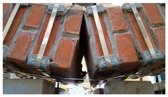 Before tying the two strips of CFRP together, the strips work independently, in the sense that there is no bound between them. In particular, the ultimate flexural strength of the masonry wall depends on the strip applied on the stretched side. In fact, due to buckling, the strip on the compressed side of a bent wall undergoes delamination before the stretched strip (Figure 18).