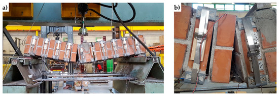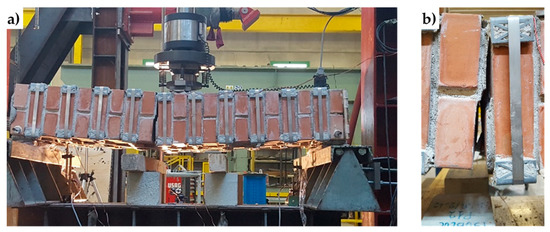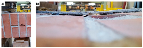 From the comparison between the failure cross-sections of Specimen W3 (Figure 48) and Specimen W4 (Figure 49), it follows that the internal hinge of Specimen W4 localized on the same cross-section as the internal hinge on Specimen W3 (9th mortar bed joint from the left). In addition to this, a second internal hinge has formed for Specimen W4 on the 8th mortar bed joint from the left (Figure 49b). This happened because the strapping provides an infinite degree of internal hyper-staticity to the isostatic static-scheme of the hinged supported I-beam, which allowed the formation of multiple plastic hinges on the cross-sections, without ever reaching a labile configuration (until the straps are broken).