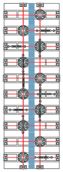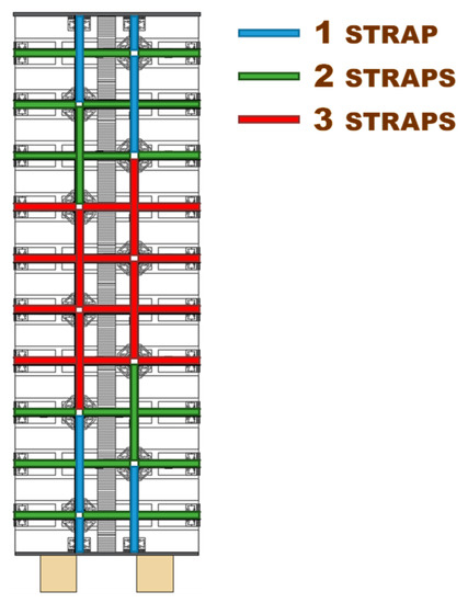 As shown in Reference [15], it is possible to re-arrange the CAM straps to find a statically determined strap configuration for lateral loads, in order to increase the load-bearing capacity for shear loads. In fact, arranging the straps along the two principal directions of stress for shear stress—which form angles of ±45° with respect to the horizontal direction [16]—provides a cross bracing effect in the plane of the wall (Figure 14).