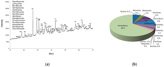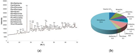 Two different types of metallurgical slag, electric arc slag (Slag A) and ladle slag (Slag R), from Slovenian metallurgical steel and iron plants were tested as potential precursors for alkali activation to be used in this study. Since it was received in aggregate form, milling and sieving into powder form of less than 63 µm was performed prior to chemical analysis, analysis of mineralogical composition and alkali activation. Elemental chemical composition was determined by X-ray fluorescence (XRF) with a Wavelength Dispersive X-ray Fluorescence (WD XRF) instrument (Thermo Scientific, Thermo electron SA, Ecublens, Switzerland). Samples were prepared by mixing slag with fluxana (lithium tetraborate and lithium metaborat 50%) at a ratio of 1:10, which was then melted at 1025 °C. Loss on ignition of the samples was determined according to EN 196-2:2013 (https://www.zag.si/ajax/DownloadHandler.php?file=1584, accessed on 5 April 2019).
