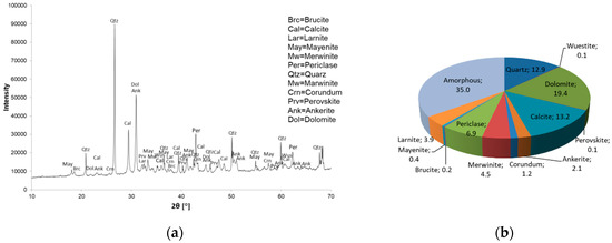 Chemical analysis (XRF) of both types of slag is presented in Table 3. Slag A is an electric arc furnace type slag, while Slag R is a ladle furnace basic slag produced in the secondary stage of refining, when the steel is desulfurized. Due to these differences in production, the content of elements varies; for example Slag A has a higher content of SiO2 and Al2O3 than Slag R, but a lower content of CaO and MgO.
