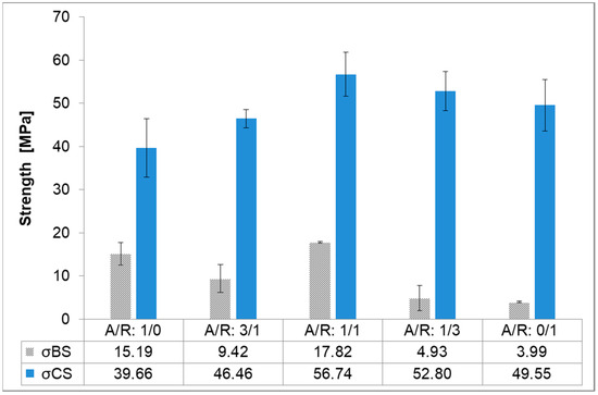 Based on the results of the mechanical properties, as presented in Figure 3, both the maximum bending (σBS) and compressive strength (σCS) was achieved in the case of the mixture AR 1/1, in which bending and compressive strength were measured as 17.8 MPa +/− 1.2 MPa and 56.7 MPa +/− 2.3 MPa, respectively. In other mixtures σBS ranged from 5 to 17 MPa and σCS from 39 to 56 MPa. According to the (Na + K)/Al/Si ratio, as well as the measures of strength, the mixture with a ratio of A/R: 1/1 was confirmed to be the optimal mixture and therefore selected for further study on the effects of curing on the development of mechanical strength.