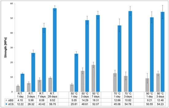 Bending (σBS) and compressive strengths (σCS) of A/R: 1/1 specimen cured at different temperatures (room temperature (R.T.), 50, 70 and 90 °C) and cured for different period of time.