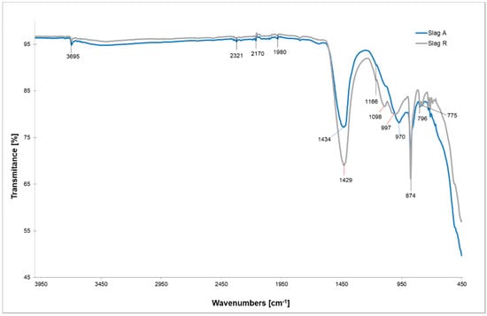 Figure 5 shows the IR spectrum of both unreacted slags. The major band lies in the 970–1160 cm−1 range, corresponding to the asymmetric stretching vibration of Si–O–Si and the Si–O–Al bonds [30]. The intensive bands at 1434 and 1429 cm−1 (for Slag A and Slag R, respectively) are related to the modes of CO3 contained in CaCO3, as also confirmed by XRD analysis. It has been reported that this main carbonation band also has a peak at 874 cm−1, which is also seen in both slags as a very intensive and sharp peak [31]. Due to the unreactive nature of this crystalline phase it stays present also after the alkali activation process (Figure 6). The peak that indicates the presence of quartz is observed at 796 cm−1 [32].