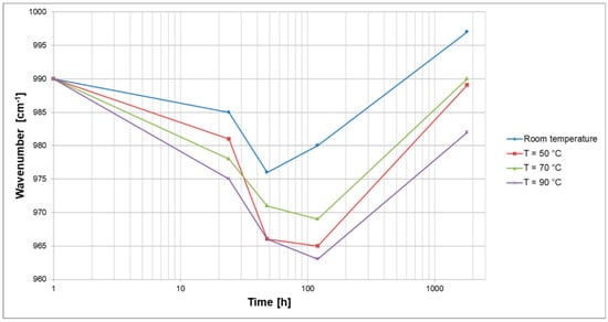 Peaks at approximately 1418 cm−1 and 990 cm−1 correspond to the Si–O vibrations from potassium silicate, and also reduce as the length of the process increases. The major band appears in the 900–1100 range, assigned to the vibration of Si–O–T (T = Si or Al) bonds. A typical representation of changes in wavenumbers attributed to the Si–O–T band shift is shown in Figure 7. In all cases, there is firstly a drop in the peak position of a wavenumber, followed by a gradual increase, which could be attributed to the severing of pure silica bonds and incorporation of Al into the gel [34,35], an effect which becomes more pronounced at a higher curing temperature.