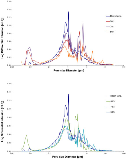 Differential mercury intrusion porosimetry of A/R: 1/1 specimen cured at different temperatures (R.T., 50, 70, 90 °C) for one (above) or three days (bottom).
