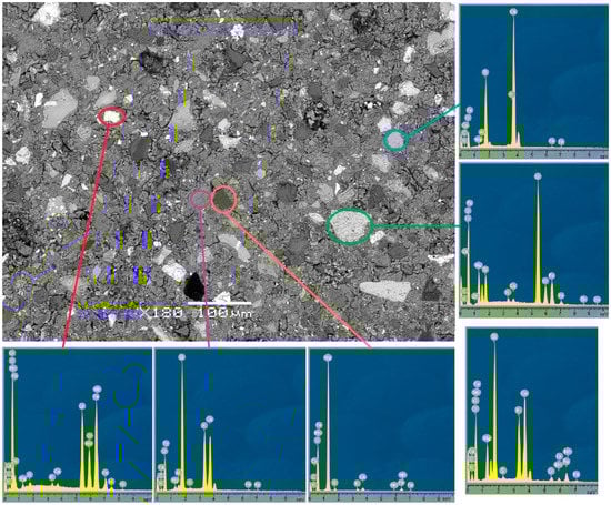 Microstructural analysis was carried out by SEM investigation of the Slag A and Slag R powder (Figure 10a,b) and on the polished surface of A/R: 1/1 specimens treated at elevated temperatures for different curing times (Figure 11a–d). The main elements in AAM were determined with Energy Dispersive Spectroscopy (EDX), and are shown in Figure 12. From the scans of precursors (Figure 10a,b) it is obvious that distribution of the particles is not uniform and is comparable for both milled and sieved slags. The shape of particles is random with many sharp edges due to the milling. The different particles’ shades of gray are defining different elemental structure, where particles, according to chemical analysis performed by Energy Dispersive X-Ray Spectroscopy (EDX) presented on Figure 12, in red circles contain more Mg, particles in orange circles more Si, and particles in yellow circles more Ca. There are many particles seen also after activation (Figure 12) that have similar elemental structure as particles in slags (Figure 10), meaning that they did not form during AA, since those particles did not react with alkali, and present in AAM only the filling. EDX of AAM (Figure 12) area circled with purple presents matrix, where element in abundance is Si, followed by K and Ca. On Figure 11a,b are marked different defects present in AAM.