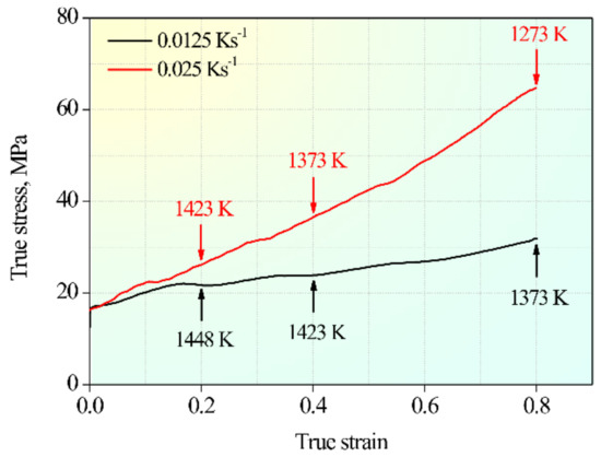 Figure 1 shows the flow curves of 18Mn18Cr0.6N steel compressed at 10−4 s−1 under different cooling rate conditions. The black curve was obtained at a cooling rate of 0.0125 Ks−1 and the red curve at 0.025 Ks−1. The instantaneous temperatures at different strains are marked on the curves. Under both cooling rate conditions, the flow stress increased with increasing strain. The flow curves were of the work-hardening type, rather than DRX or DRV type. The higher the cooling rate, the higher was the hardening rate.