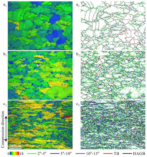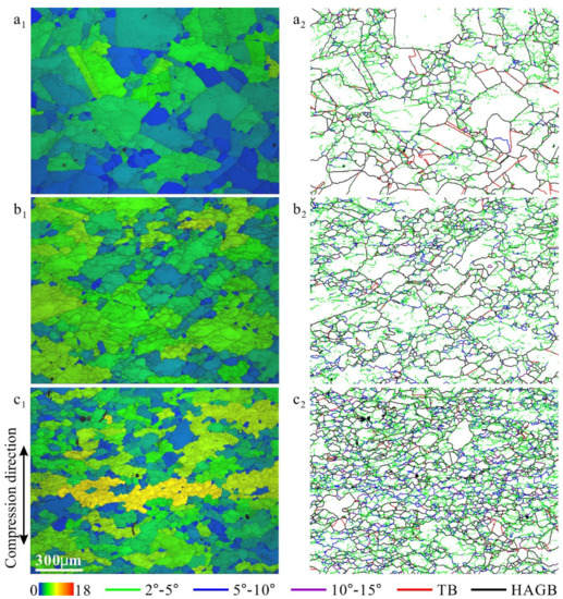 Microstructures of 18Mn18Cr0.6N steel compressed at 10−4 s−1 and a cooling rate 0.025 Ks−1 to different strains: 0.2 (a1,a2), 0.4 (b1,b2), and 0.8 (c1,c2). (a1), (b1), and (c1) are band contrast images overlaid by grain orientation spread images; (a2), (b2), and (c2) are grain boundary characteristic distribution images. The vertical direction is the compression direction.