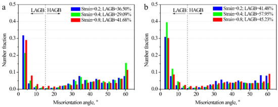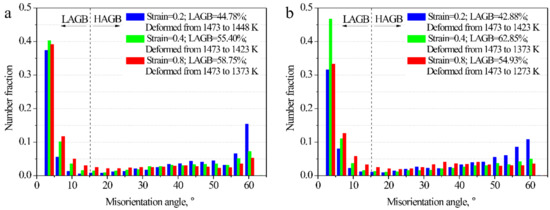 Figure 5 shows the distribution of misorientation angles of specimens deformed at different cooling rates. At a cooling rate of 0.0125 Ks−1 (Figure 5a), the higher the strain, the larger was the number fraction of LAGB (increasing from 44.78% to 58.75% for strains of 0.2 to 0.8). At a cooling rate of 0.025 Ks−1 (Figure 5b), the highest number fraction of LAGB was in the 0.4-strained specimen (62.85%). Under both cooling rate conditions, the fraction of HAGB was largest in the 0.2-strained specimen. The density of twins in the 0.2-strained specimen was high because the strain was not considerably high to destroy the existing twins in the parent grains. There was inadequate DRX in the 0.8-strained specimen.