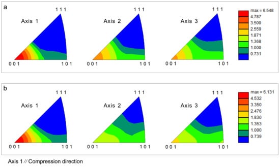 Texture usually forms in deformed specimens where DRX is not adequate. The inverse pole figures of 18Mn18Cr0.6N steel compressed to a strain of 0.8 under continuous cooling are shown in Figure 7. Axis 1 was parallel the compression direction during EBSD examination. An intense <001> fiber texture formed in both 0.8-strained specimens. The maximum intensities were above 6 under both cooling rate conditions.