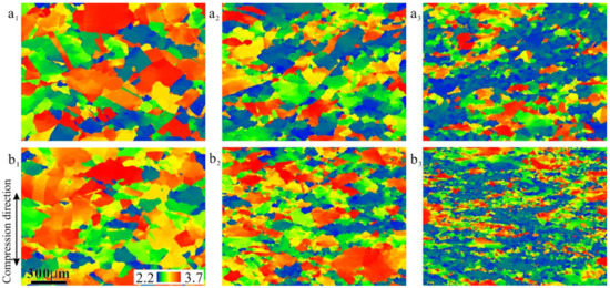 Each water-cooled specimen was cut along the compression direction. After grinding using 4000 grit SiC paper, the sectioned specimen was polished for 3 h using a chemo-mechanical slurry containing colloidal silica (20 nm). The microstructure was observed using electron backscatter diffraction (EBSD) analysis with TSL-OIM-Analysis software (version 7, EDAX, Mahwah, NJ, USA). Grain orientation spread (GOS) was determined by calculating the average deviation between the orientation of each point in a grain and the average orientation for the grain. A grain was defined as a region surrounded by the boundaries which have misorientation larger than the default value of 5°. Taylor factor maps were calculated. The uniaxial load of specimen was parallel to Axis 1 in the microscope. Therefore, a 90° rotation of the data about Axis 2 was performed after scanning to get it into the right reference frame according to OIM Analysis Help [17].