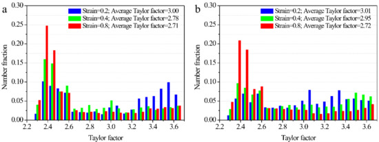 Figure 8 shows the Taylor factor images of specimens deformed under continuous cooling. The Taylor factor were used in the analysis of the plastic deformation of polycrystalline metals and implies the distribution of the grain orientations; grains could be classified into “hard” and “soft” based on their Taylor factors [17,18]. At strains of 0.2 and 0.4 under both cooling rates, the distributions of Taylor factors were random (Figure 8(a1,a2,b1,b2)); however, there were large areas with low Taylor factors (blue and green colors) in the 0.8-strained specimens (Figure 8(a3,b3)). The smaller the Taylor factor, the ‘softer’ was the grain. Figure 9 shows quantitative results for the Taylor factor distributions. Under both cooling rate conditions, the higher the strain, the smaller was the average Taylor factor. Although the DRX content was small, the extremely low strain rate gave the matrix enough time to recovery and then the matrix evolved to a soft orientation to coordinate deformation through DRV and rotation. It should be noted that the statement of a soft orientation was based on the Taylor factor data. Detailed micro-texture analysis is needed to support it in further study.