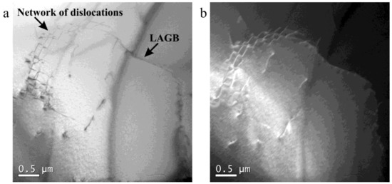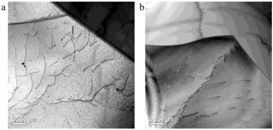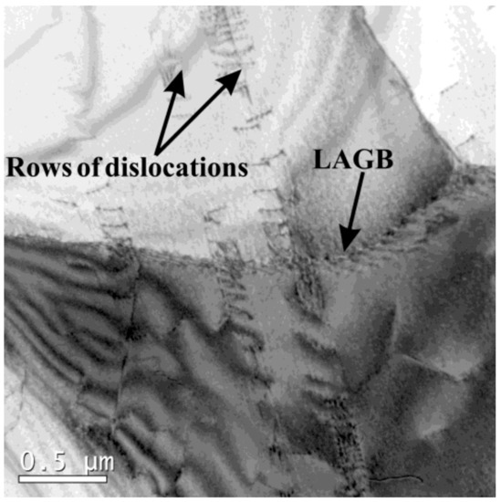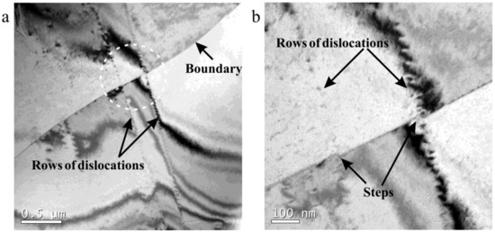 In addition, dislocation arrays were found in a deformed specimen, as shown in Figure 13 and Figure 14. In Figure 13a, dislocation arrays transferred through a boundary (HAGB or twin boundary), similar to that of a cold-deformed microstructure in 18Mn18Cr0.5N steel investigated by Jandová et al. [19]. Figure 13b shows that the dislocation arrays induced steps on the boundary. Figure 14 shows the transfer of dislocation arrays through an LAGB. Dislocation accumulation at boundaries was obviously weak in this study, which made it difficult for DRX nucleation to occur.