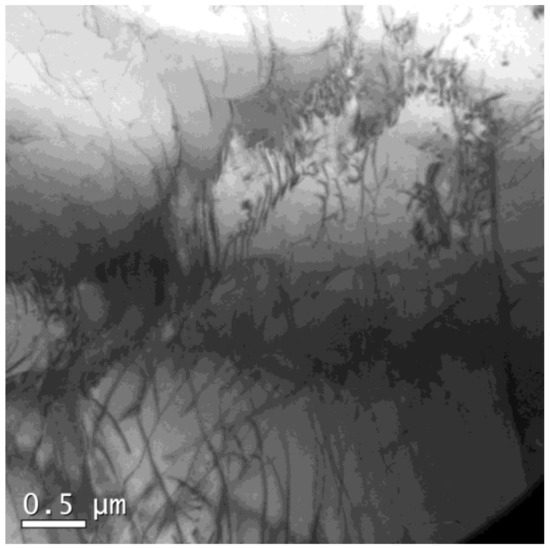 Wang et al. reported [8] that subgrains formed at high temperature are larger and have no energy advantage to transform to DRX nuclei in comparison with those formed at low temperature. It was therefore of interest to understand the evolution of subgrains formed in the early stage of compression (at high temperature) during the subsequent (low-temperature) deformation stage. Figure 11 shows the dislocation morphology in a subgrain in 18Mn18Cr0.6N steel compressed at a cooling rate of 0.0125 Ks−1 to different strains. Dislocations distributed separately in the subgrain. Most dislocations were single and did not entangle with each other or with the subgrain boundary. Similar dislocation morphology was found in a subgrain in 18Mn18Cr0.6N steel compressed at a cooling rate of 0.025 Ks−1 to a strain of 0.8 (Figure 12). The dislocation density was very high in the subgrain. This is only a qualitative assumption which is based on simple observation without considering any known crystallographic approaches. These separately distributed dislocations provided no obvious beneficial effect to subgrain rotation or DRX nuclei formation.
