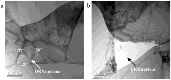 Miura et al. [20] found that DRX occurs easily at triple junctions. In this study, DRX nuclei were found at triple junctions, as shown in Figure 15. These two DRX nuclei were triple shaped and had straight boundaries, which meant that their migration rate would be low. The sizes of these two DRX nuclei at triple junctions were much smaller than that of the subgrains. This can be explained by the theory proposed by Wang et al. [21], in which it was reported that DRX grain sizes formed at triple junctions are finer because these have higher energy than other locations.