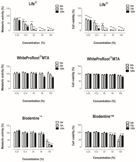 Treatment with Life® determined a significant decrease in metabolic activity at concentrations equal to and greater than 12.5% of conditioned media. The cell viability was significantly decreased in treated cell cultures. Treatment with BiodentineTM also determined a statistically significant decrease (p < 0.001) of the metabolic activity when the cells were incubated with the highest concentration studied, as well as in cell viability at 100% and 50% concentrations at all times. In contrast, WhiteProRoot®MTA did not determine significant changes in cellular metabolic activity or cellular viability.