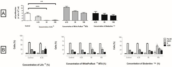 The proliferation of cell cultures treated with Life® decreased significantly at concentrations of 100% (p < 0.01) and 50 % (p < 0.001), to (0.2 ± 0.2) × 109 cells/mL and (0.112 ± 0.075) × 109 cells/mL respectively (Figure 2A). In the treatment with WhiteProRoot®MTA and Biodentine™, the proliferation of cell cultures was found to be inversely proportional to the concentration, that is, the higher the concentration, the lower the cell proliferation (Figure 2A), considering the tested concentrations.