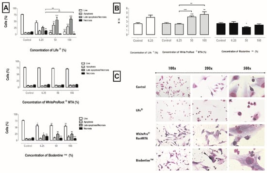 The viabilible and apoptotic cells, late apoptotic and necrotic were not influenced by WhiteProRoot®MTA. Treatment with Life® drastically changed cell viability and the type of cell death in a significant way and dependent on the biomaterial concentration. The Biodentine™ treatment negatively influenced viability at the highest concentrations with a decrease from 76.78% ± 1.44% to 54.71% ± 5.22%. Consequently, an increase of cells in apoptosis was found, from 6.57% ± 1.5% to 13.71% ± 4.49%; and an increase of cells in late apoptosis/necrosis, from 6.79% ± 0.56% to 24.14% ± 3.99%. These results can be seen in Figure 3A.