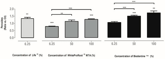 Intracellular peroxide production in MDPC-23 cells treated with Life®, WhiteProRoot®MTA and Biodentine™ after 120 h of incubation. The results are presented as a variation against control cell cultures. All the results express the mean and standard error of at least seven independent assays. In all results, significant differences from control or between conditions are represented by *, where * means p < 0.05, ** means p < 0.01 and *** means p < 0.001.