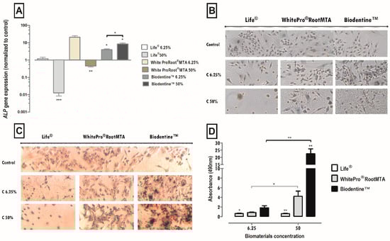 The expression of the ALP gene was significantly influenced by the treatments with the Life®, Biodentine™ and WhiteProRoot®MTA conditioned media in a concentration-dependent manner. These results can be seen in Figure 5A. The 50% concentration of Life® treatment significantly decreased the ALP gene expression to 0.013 (p < 0.001). In cultures subjected to 6.25% Life® treatment, no significant changes were observed. Treatment with WhiteProRoot®MTA at a concentration of 50% led to a significant decrease in gene expression with values of 0.46 relative to the control (p < 0.01). With Biodentine™, a significant increase in ALP expression was observed with values of 3.96 (p < 0.05) at a concentration of 6.25% and values of 8.51 (p < 0.05) at a 50% concentration, relative to the control.
