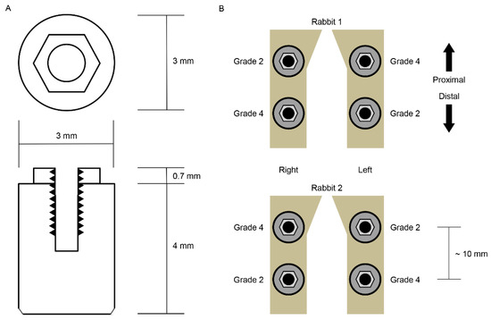 The animal study was approved by the Ethics Committee of the Animal Experimentation of the Institutional Animal Care and Use Committee (CRONEX-IACUC 201702001; Cronex, Hwasung, Korea). All the animal study procedures, including animal selection, management, preparation, and surgical protocols, were performed according to the guidelines of Animal Research: Reporting In Vivo Experiments (ARRIVE) [7]. We installed grades 2 and 4 cp-Ti implants in two male New Zealand white rabbits, each weighing 2.5 to 3.0 kg and aged about six months. They showed no sign of disease or illness before the experiment. Two implants were installed in each rabbit tibia using a standard Latin Square design (Figure 1B). Prior to surgery, the rabbits were anesthetized with an intramuscular injection of tiletamine/zolazepam (15 mg/kg; Zoletil 50, Virbac Korea, Seoul, Korea) and xylazine (33 mg/kg; Rompun, Bayer Korea Ltd., Seoul, Korea). The animals received an intramuscular injection of 33 mg/kg Cefazolin (Yuhan, Seoul, Korea), a preoperative prophylactic antibiotic. The skin of each rabbit’s proximal tibia area was shaved with an electric shaving machine and sterilized with povidone iodine solution, and local anesthetic, lidocaine (1:100,000 epinephrine; Yuhan, Seoul, Korea), was injected into each surgical site. The skin was incised with a surgical blade, and full-thickness periosteal flap reflection was performed to expose each tibia. The implant preparation drilling was conducted on the flat surface of the tibia using a 3-mm-diameter final dental implant drill under simultaneous sterile saline irrigation. The implant was inserted into the drill hole so that the top of the implant was 0.5 mm above the upper cortex of the rabbit tibia without contacting the lower cortex using a silicone ring. Four implants were installed into each rabbit—two grade 2 cp-Ti implants and two grade 4 cp-Ti implants—in a Latin Square design (2 × 2 Latin Square, n = 4). After the insertion of the implants, the surgical sites were sutured layer by layer. We allowed a relatively long healing period to present similar bone–implant contacts for the two different types of implants. Rabbits were sacrificed after six weeks of bone healing by intravenous administration of potassium chloride following anesthetization. The implants were exposed by full thickness periosteal elevation and retrieved en bloc with the adjacent bone collar.