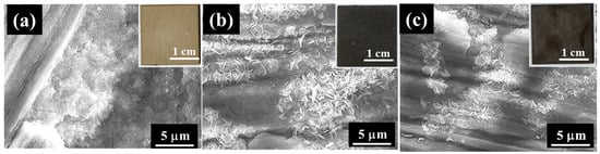 SEM images of films prepared at 423 K for 5 h on (a) AZ31, (b) AZ61, and (c) AZ91D. All insets show the appearance of the film surfaces.