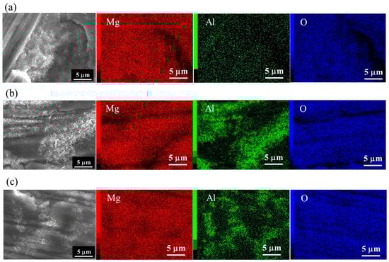 FESEM and elemental Mg, Al, and O mapping images of film prepared at 423 K for 5 h on (a) AZ31, (b) AZ61, and (c) AZ91D.