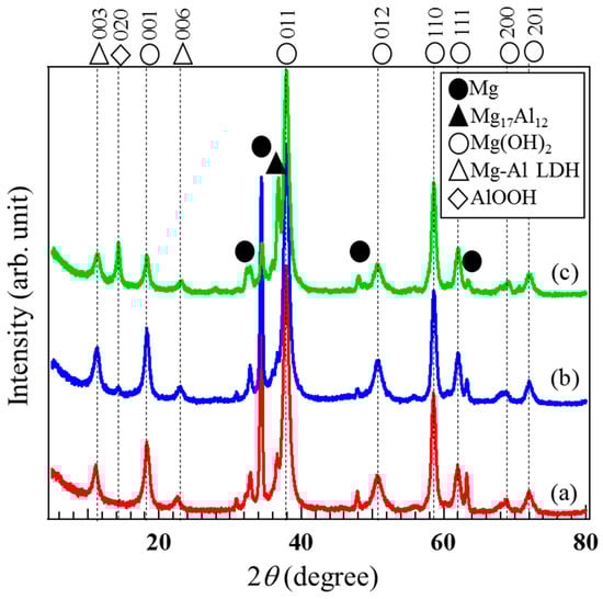XRD patterns of the films prepared at 423 K for 5 h on each Mg alloy: (a) AZ31, (b) AZ61, and (c) AZ91D.