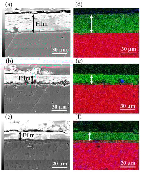 Cross sectional SEM and overlapped mapping images for Mg (red), Al (blue), and O (green) of film prepared at 423 K for 5 h on (a,d) AZ31, (b,e) AZ61, and (c,f) AZ91D.