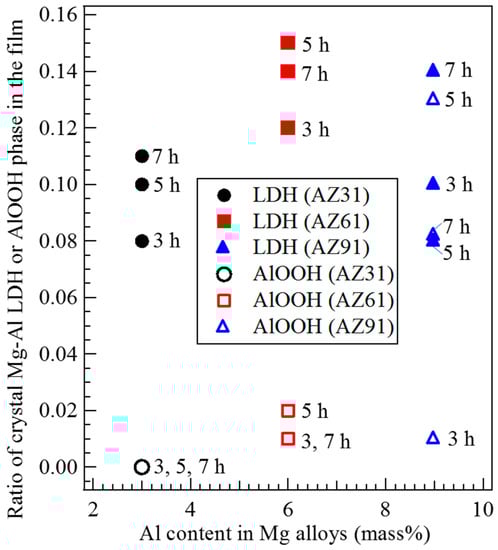 Relationship between the Al content in Mg alloys and the ratio of crystalline Mg-Al LDH or AlOOH phase formed in the films prepared at 423 K for 3 to 7 h.