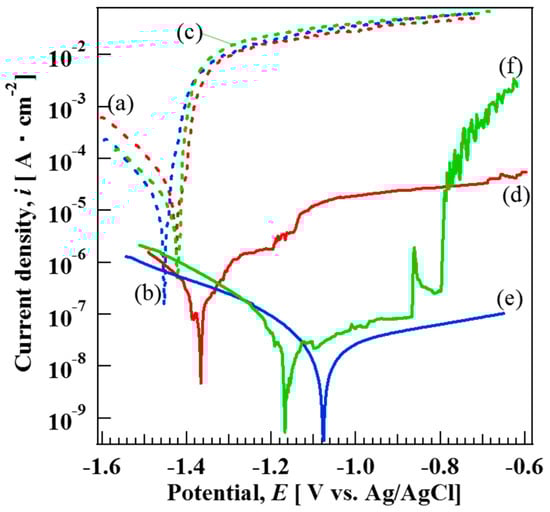 Potentiodynamic polarization curves of bare (a) AZ31, (b) AZ61, and (c) AZ91D and film-coated (d) AZ31, (e) AZ61, and (f) AZ91D in 5 mass% NaCl aqueous solution.