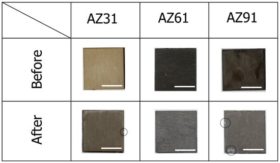 Appearances of films prepared at 423 K for 5 h on AZ31, AZ61, and AZ91D before and after immersion for 480 h in 5 mass% NaCl aqueous solution. All scale bars are 1 cm.