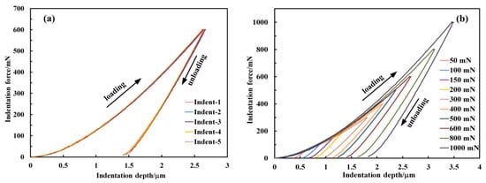 Based on the above calculation, the dependences of Young’s modulus and hardness on the indentation force are shown in Figure 4a,b for Berkovich and flat-tip indenters, respectively. As seen from Figure 4a, Young’s modulus decreased rapidly from 115 to 75 GPa with force from 50 to 300 mN and kept in the range of about 60–70 GPa with force from 300 to 1000 mN. In the case of hardness, it also decreased as the applied force were increased under Berkovich indentation with a range of 6–10 GPa. Under the flat-tip indentation, as shown in Figure 4b, Young’s modulus and hardness increased linearly with the applied force due to the constant indentation-induced contact area.