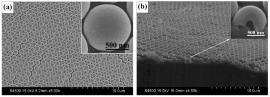 Figure 1a). These microspheres are close-packed and periodically assembled as a single-layer ordered structure. The magnified image of a single microsphere indicates a diameter of about 1 μm. The cross-sectional image (
