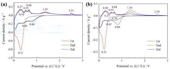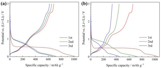 Galvanostatic discharge–charge tests of cells were performed on a battery test system (CT2001A, LAND, Wuhan, China) using different current densities from 0.1 to 2.0 A g−1 in the voltage range of 0.02–3 V. Cyclic voltammetry (CV) tests were carried out on an electrochemical workstation (PGSTAT302N, Autolab, Utrecht, The Netherlands) at a scan rate of 0.1 mV s−1 between 0 and 3 V.