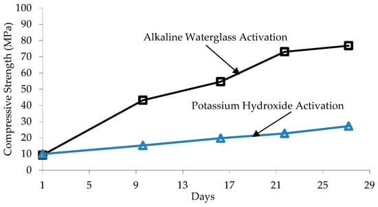 The most effective materials to activate aluminusilicates (GGBS, fly ash, etc.) include alkali hydroxide ROH, nonsilicic salts of weak acids R2CO3, R2S, RF, or silicic salts of the R2O·nSiO2, where R indicates an alkali metal ion such as Na, K, or Li [11,12]. Jin et al. [13] used MgO to activate GGBS paste and determined that the main hydration product is C-S-H in addition to a hydrotalcite-like phase that produces less porous structure and higher compressive strength. However, excessive hydrotalcite could causes cracks in the paste which could affect strength and durability [13]. Indeed, the most reported alkaline activators in the literature, include sodium hydroxide (NaOH), potassium hydroxide (KOH), sodium carbonate (Na2CO3), and sodium silicates which is also available as water glass (Na2O·nSiO2·mH2O). These alkaline activators produce concrete and paste with different short-term and long-term properties. Brough and Atkinson [3] reported that KOH produced more rapid reaction, less homogeneous microstructure, and lower strength compared to AAS mixes activated using sodium silicates. Compared to water glass, KOH offers high compressive strength within one day of casting, but strength development slows down significantly after one day. Figure 1 shows compressive strength development of 16 × 16 × 160 mm3 AAS mortar samples activated using water glass compared to samples activated using potassium hydroxide [3].