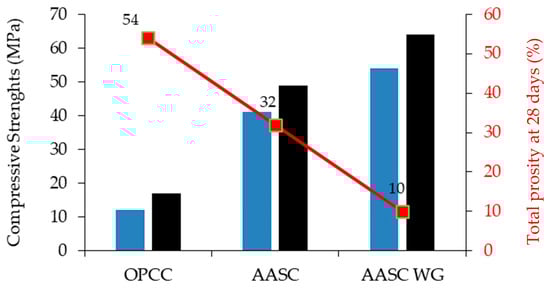 Compressive strength after 7 and 28 days of curing, and total porosity of 100 mm × 100 mm × 100 mm cubes of OPC concrete (OPCC), alkali-activated slag (AAS) activated using water glass (AAS-WG), AAS activated using NaOH (AAS-N) [25].
