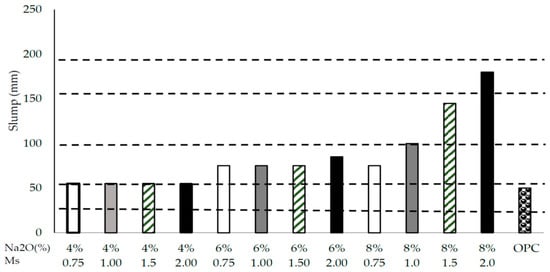 The dosage of Na2O and silicate modulus of the activator solution also affect the flowability of AAS. As shown in Figure 3, for a specific silicate modulus, the higher the dosage of sodium oxide the higher the slump of AAS mix. This increase in slump is more predominant in the case of silicate modulus, as high as 2.0, where a sodium oxide dosage of 8% produces much higher slump compared to all tested dosages and compared to the equivalent control OPC [24]. The higher the dosage of sodium oxide the higher the slump of AAS.