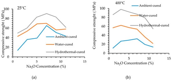 Effect of Na2O dosage (%) on compressive strength at (a) 25 °C, (b) 400 °C [23].