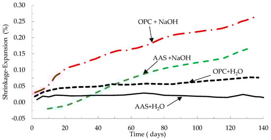 Fernandez-Jimenez and Puertas [48] studied Alkali–aggregate reaction in mortar mixes using AAS as binder and compared the results to OPC samples. The aggregate used in making the samples contained 21% reactive silica. The mixes were prepared using slag activated with calcium hydroxide NaOH solution with Na2O equals to 4% by weight of slag. The activator solution to slag ratio was 0.57. They concluded that ASR expansion occurs in AAS specimens but at a slower rate compared to OPC mortar specimens. The authors observed expansion of samples due to the formation of sodium and calcium silicate hydrate reaction products with rosette-type morphology. After 140 days, AAS mortar specimens immersed in water showed very little expansion compared to OPC samples immersed in water. As shown in Figure 6, AAS mortar samples showed less expansion compared to OPC mortar samples immersed in NaOH solution. Shi et al. [20] investigated alkali–silica reaction (ASR) of mortars prepared using slag activated using 4%, 6%, and 8% wt Na2O by mass of slag. The accelerated ASR test was conducted by submerging mortar samples in 1 mol/L of NaOH solution and ASR expansion of mortar samples was measured up to 28 days. Before adding the NaOH solution, the alkalinity of the pore solution was higher in AAS mortars compared to Portland cement mortars. However, 28 days after adding the NaOH solution, the alkalinity of the pore solution of the mortars was higher in Portland cement mortars than in AAS mortars. As a result, ASR expansion was lower in AAS mortars compared to the Portland cement mortars.