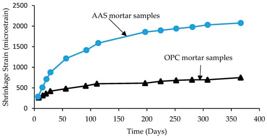 Generally speaking, weight loss during drying is higher in OPC concrete compared to AAS concrete samples, yet drying shrinkage is higher in AAS samples compared to OPC samples. Therefore, drying shrinkage is not entirely due to weight loss of weight from concrete [50]. Figure 7 shows that shrinkage strain in AAS concrete samples is consistently higher than OPC concrete samples. However, after 365 days, the difference between drying shrinkage of AAS and OPC becomes constant [50].