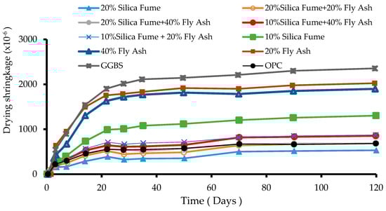 Drying shrinkage in AAS concrete may be reduced through partial replacement of GGBS with silica fume [28]. Partial replacement of GGBS by 10% or 20% silica fume was more effective in reducing drying shrinkage in AAS mortars compared to replacing GGBS with 20% or 40% fly ash. However, replacement of GGBS in AAS mortar with 20% silica fume produces slightly lower compressive strength compared to 10% replacement percentage [28]. It may be concluded that the significant reduction in drying shrinkage of AAS with 20% silica fume, to even below control OPC control, may outweigh the relatively smaller compressive strength in AAS mortars containing 10% silica fume. As shown in Figure 8, partial replacement of GGBS in AAS concrete with 20% silica + 20% fly ash is highly effective in reducing the overall shrinkage of AAS concrete.