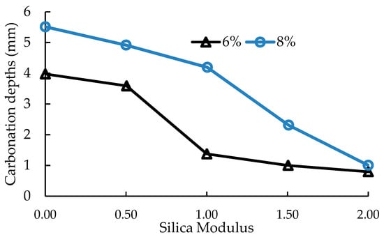 Shi et al. [62] studied carbonation of AAS mortar samples prepared used AAS activated using 6 wt.% and 8 wt.% Na2O by mass of slag. Samples prepared with AAS activated with alkaline solutions having different moduli were stored in carbonation chamber for 56 days. They noted that alkali-activated slag mortars are more susceptible to carbonation under accelerated carbonation condition compared to the Portland cement mortar. However, it may exhibit higher carbonation resistance under natural conditions, especially when AAS is activated with water glass having high modulus. AAS mortars with high alkali content and high silicate modulus have reduced total porosity and average pore size. This results in increased carbonation resistance and compressive strength. Figure 9 shows that increasing the silica modulus decreases the carbonation depth of AAS mortars. In addition, the carbonation depth of AAS mortars made with 8% Na2O is lower than AAS mortars made with 6% Na2O.