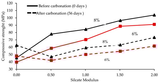 Effect of silicate modulus on compressive strength of the AAS mortars with different alkali dosages before carbonation (after steam curing) and after 56 days of carbonation [56,62].